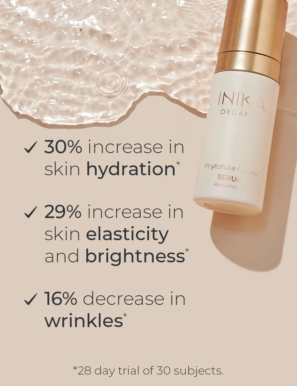 - Increase skin elasticity by over 67% and skin moisturisation by over 40% in just 28 days when used in combination with INIKA Organic Phytofuse Renew™ Maca Root Day Cream*